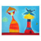 Whimsical art illustration of King and Queen.Light blue, red, yellow, orange, golden , white colors.