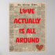 Celebrate timeless romance with this charming “Love Actually Is All Around” poster, designed in a vintage newspaper style that blends nostalgia with heartfelt emotion. Featuring bold red lettering layered over an old-world newspaper backdrop, this artwork feels like a discovered headline straight from the past—one that delivers a message of warmth, hope, and love.