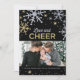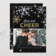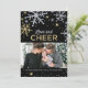 Festive holiday photo card design features sparkling silver and gold snowflakes and "Love and Cheer" wording with custom text and a picture that can be personalised. Snowflake border and script have a textured glitter looking appearance on a black background.
