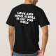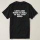 Heart Cage SoS logo on the "pocket" and the timeless message "Love and Rock N Roll is all you need" on the back. It's poor grammar, but a great message!