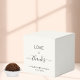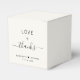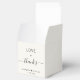 Chic light cream favour box for your wedding featuring "love + thanks" in simple modern typography and an elegant calligraphy script with swashes, your first names joined together by a heart and your wedding date.