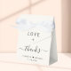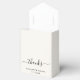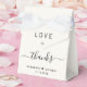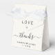 Elegant light cream wedding favour box featuring "Love + Thanks" in simple modern typography and a chic script with swashes, your first names joined together by a heart and your wedding date.