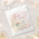 Thank your bridal shower guests with these cute favour bags. The cute design features a storybook romance them with a watercolor of an open book with a pink rose lying on the pages. Balanced in the pages is a gold engagement ring forming a heart shaped shadow. The caption on the book reads "A New Chapter Begins." The title of the bag is written in elegant modern script lettering and reads Love and Thanks! There are cute hearts scattered about and room for her name and the date of the shower below. Perfect for a book lover's bridal shower!