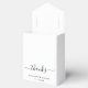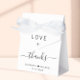 Chic wedding white favour box featuring "Love + Thanks" in simple modern typography and an elegant script with swashes, your first names joined together by a heart and your wedding date.