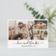 Minimalist, Simple, Elegant Hand Lettered Script Wedding Photo Thank You Card. Stylish wedding card template featuring three (3) photo on the front and one (1) photo on the back side. With the text "Love and thanks" in a swirly hand lettered typography script swash tail font in black on white background. Personalize with your name and thank you message. Little heart doodle between the names. If you prefer to handwrite your note, just delete the sample text to make more space. If You need help or matching item, please contact to me!