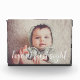 Simple and modern baby photo keepsake block features your favourite horizontal or landscape orientated newborn photo, with a white text overlay reading "love at first sight" in handwritten style brush lettered typography. A modern and minimal gender neutral design that makes a perfect gift for new parents.
