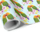 Two love birds together on aq tree branch with pink, white, yellow and purple flowers all around them in a backdrop of blue