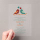 Celebrate your special day with this charming love birds wedding invitation, featuring a beautifully simple illustration of two birds facing each other. One bird is designed in soft cool tones, while the other with warm hues, symbolizing the harmony of two unique souls coming together. The clear acrylic adds a delicate, neutral touch, making this design perfect for weddings with a modern yet playful feel. With its balanced color palette of cool and warm shades, this invitation suite is a wonderful choice for couples looking to express their love in a lighthearted and elegant way. Fully customizable to suit your event details.