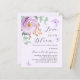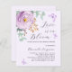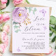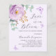 A soft lilac coloured background. Decorated with a lilac and purple rose and green watercolored eucalyptus greenery and butterflies. Personalise and add your name and party details. Text: Love is in Bloom.