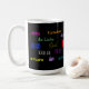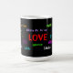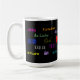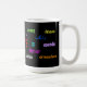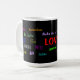 Coffee Mug with the word LOVE in a bold red and various other "love" words in other languages in colourful fonts on a black background.