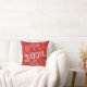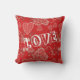 Red and white LOVE typography accent pillow with a cute doodle hearts pattern and a heart shape custom couple's photo with names' initials.