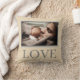Celebrate the birth of your baby by decorating your baby nursery with this beautiful modern custom photo pillow that says LOVE in easy to read letters. Personalise with your own photo that sits in a pretty double frame in soft shades of grey against a neutral beige background.