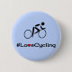 This is a fun button for a keen cyclist, depicting a single cyclist as a pictogram, and the hashtag slogan #LoveCycling. The background is coloured light blue, and the 'V' of Love has been transformed into a red heart.
