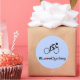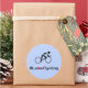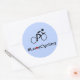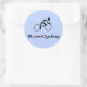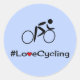 This fun sticker for a keen cyclist has a single cyclist pictogram, and the hashtag slogan #LoveCycling. The 'V' of Love has been transformed into a red heart and the background is light blue.