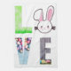 Love Easter -design with the "O" in Love being replaced by a cute Easter Bunny face and the remaining letters are filled with Easter themes such as Easter Eggs and bright green spring grass.