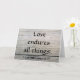 Quote from scripture from First Corinthians on love and endurance. Photo background is a distressed wooden table. Small cracks and grooves in the wood, in colour variation of light greys and browns. The image evokes seriousness and authenticity to any message such as sympathy on loss of a loved one. Blank inside for your own message.