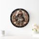 This charming autumn-themed clock features an adorable doll with long dark braids, wearing a knitted hat with a pom-pom, a cosy sweater, and boots. She holds a sign that says "LOVE FALL". Sunflowers, wheat, and pumpkins surround her. The clock has a black border with white numbers 1-12.