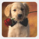 Golden Retriever Love These fun stickers feature an image of a blonde Golden Retriever puppy holding a red rose highlighted with a tan brown background.