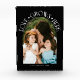 Modern and minimal family memory photo block featuring a photo in a arch frame with a text that says "Love Grows Here" with tiny hearts. Black.