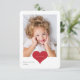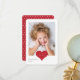 A simple, minimal photo classroom valentine's day card with modern red heart with love inside on a clean and simple white background. The accompanying pattern backer has a repeating heart pattern in red and white.