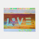 Love hippie bohemian boho doormat. Bright green, pink, yellow rust, copper colours. Word 'LOVE' painted on wood. Go out in style with this colourful, chic, trendy, cool, modern home decor item.
