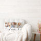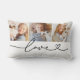 Modern and stylish custom lumbar throw pillow design features a photo collage of three (3) favourite photos with a simple and minimal black "Love" typography design that includes flourish and heart details. The black and white colours can be modified.