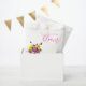 Love is in bloom! Vibrant floral wedding collection featuring a bouquet in a marble vase surrounded by butterflies, and accompanied by fuchsia script typography.