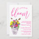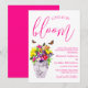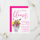 Love is in bloom! Vibrant floral wedding collection featuring a bouquet in a marble vase surrounded by butterflies, and accompanied by fuchsia script typography.