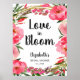 A bridal shower welcome sign poster features "Love in Bloom," bride's name, and the date in chic lettering surrounded by elegant pink flowers. CHANGE THE SIZE to fit your event. MATCHING items and more signs in our collection.