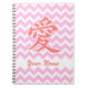 This stylish notebook features the Chinese and Japanese character for "Love," written in dark pink. The symbol appears on a pastel pink and white chevron-style zigzag background, with a space to add your own name or short message in a pink script font. If you would like to change the light pink zig-zag colour, click on "Customise it!" to select a different background.