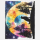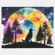 Watercolor Retriever Dog waiting: Silhouette against Full moon, Colourful with clouds and trees,