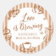 Celebrate love with a warm, inviting touch using this charming “Love is Brewing” bridal shower stickers.