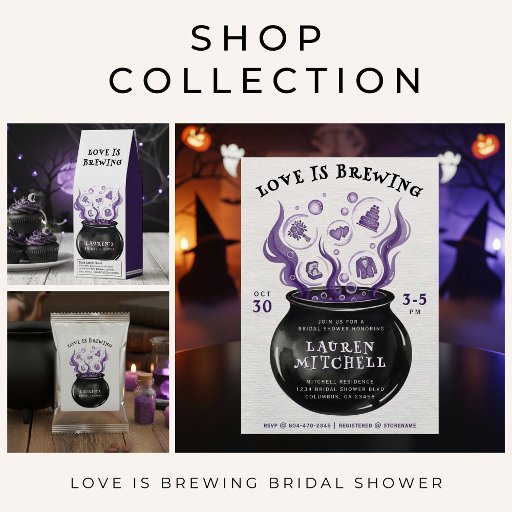 Stir up some love this fall with this witchy "Love is Brewing" Halloween bridal shower invitation. Featuring a magical witch's cauldron bubbling over with wedding items, this invitation is perfect for brides-to-be who love a spooky twist. It's purple, black and white color scheme is perfect for gothic event.. Personalize it to make your celebration uniquely yours.