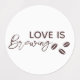 The label design features the signature phrase “Love is Brewing” prominently at the top, accented with delicate coffee beans for a warm, whimsical touch. The dark brown text and illustrations on a crisp white background create a cozy yet sophisticated aesthetic, making the label a stylish, cohesive addition to the full Love is Brewing collection.
