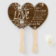 This lovely heart-shaped hand fan features a background image of teal blue tooled leather, shabby chic white lace, and an excerpt from the Bible passage I Corinthians 13 (the "love chapter"): Love is patient, love is kind, it does not envy, it does not boast, it is not proud, it is not rude, it is not self-serving, it is not easily angered, it keeps no record of wrongs, it does not delight in evil. Love rejoices in the truth. It always protects, always trusts, always hopes, always perseveres. Love never fails." The verse is written in mixed typography (fancy fonts). Perfect for rustic country weddings or anniversaries.