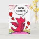 Love is Everything, greeting card written in Welsh. Cariad Yw Popeth written on the cover in Welsh. A cute red dragon surrounded by hearts and daffodils is featured on the cover. Art, image, and verse copyright Shoaff Ballanger Studios, 2025.