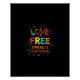 A graphic design with the message "LOVE IS FREE. SPREAD IT EVERYWHERE," encouraging viewers to share love and kindness. The text is styled with a playful, hand-drawn font in various colours and surrounded by yellow stars.