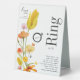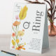 This charming table tent sign is the perfect way to display your "Put a Ring on it" bridal shower game. This tabletop sign stands easily on any plain surface, making it an effortless piece of décor. It features a unique design with a mix of elegant scripts: "put a" in a small font inside a ring illustration, "Ring" displayed vertically in a bold script, and "on it" below it. The game rules and directions are also displayed in a clear horizontal script. This sign is fully customisable with the bride-to-be's name, and it's beautifully adorned with our spring wildflower artistry, creating a delightful piece of party decor.