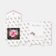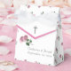 Design features a pattern of roses as full background. Front design displays names of bride and groom along with date of wedding in silver-coloured font towards lower right. Two pink roses are featured intertwined beside text. Front flap features image of a silver-coloured cross in centre. Flap is outlined in a pink border. The customisable text, "Thank You!" is seen when flap is lifted. Back design features customisable photo of a rose in full bloom. Designed to coordinate with the "Love is in Bloom Wedding Suite."