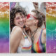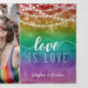 Charming rainbow ombre trifold wedding invitation with love is love written beneath fairylights hanging against a rainbow ombre background. Write your names on the cover in a fun script, and add a photo on the back.