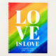 This colourful Planner is decorated with LOVE IS LOVE in bold white typography on a watercolor rainbow background of red, orange, yellow, green, and blue.