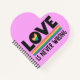 LGBTQ pride month notebook featuring the caption "love is never wrong" in black all caps fonts decorated with a little rainbow heart and a colourful stripe on a pink background.