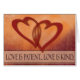 Love is patient love is kind. Two hearts against a gold and deep red background.