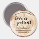A change of date might be needed for your wedding, no worries, send a New Save the Date announcement with these unique round magnets. Featuring a wood disc cut design that's sure to stand out. "Love is Patient" in a modern script for "Save your NEW date". Customize the words with the bride and groom's names, location, and wedding website (delete it if you don't need it).