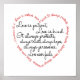 This inspirational print features a short version of 1 Corinthians 13:4 "Love is patient, Love is kind...". It features the biblical verse in the shape of a heart in addition to the verse inside the heart. This print fits a standard square frame (not included).