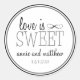 Love Is Sweet Labels / Stickers (Black / Dark Grey / Silver / White)...These fun and chic love is sweet labels / stickers are ideal for wedding favours or a wedding candy bar / buffet full of chocolate, suckers, lollipops, taffy, and sugar. Let your guests know to take a treat home with them to remember your wedding. The design features an array of whimsical fonts with the bride and groom names as well as the wedding date. Great for a candy themed wedding. Ideal for a destination wedding. Perfect for any bride or groom with a sweet tooth. Great idea for a bridal shower or bachelorette party too. Full customisable...just change the names and the dates and your favour stickers are ready to be used. Available in a wide range of colours to match your wedding colours. See WindyCityStationery.com for our complete line of "Love Is Sweet" labels in a wide range of colours as well as matching "Love Is Sweet" postage stamps, thank you cards, return address labels, save the dates and more.
