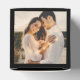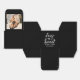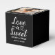 Elegant custom wedding photo favour box features a modern heart calligraphy script "Love is Sweet" design, along with a stylish minimal monogram of the bride and groom first names and "enjoy a treat" message that can be personalised. The top of the box includes a favourite photo of the couple. Black and white colours can be modified to coordinate with your wedding colour scheme.