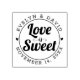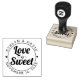 Love is sweet, names, wedding date and hearts rubber stamp. It showcases your names and date of wedding in curved text, the love quote "Love is sweet" in bold typography and it is accented with two hearts.