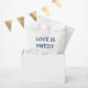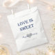 A custom favour bag reading "Love is sweet. Thank you for sharing our special day." Personalised with the bride and groom's names written over a heart, and the wedding date. Perfect for favours, candy buffets, and more!