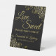 This pretty tabletop sign is perfect for a treat table at your wedding reception. It features a simple yet elegant black and gold design with script lettering and golden faux foil lace frills in the corners. The sign reads: Love is Sweet, please take a treat! There is room for your names and the wedding date below.